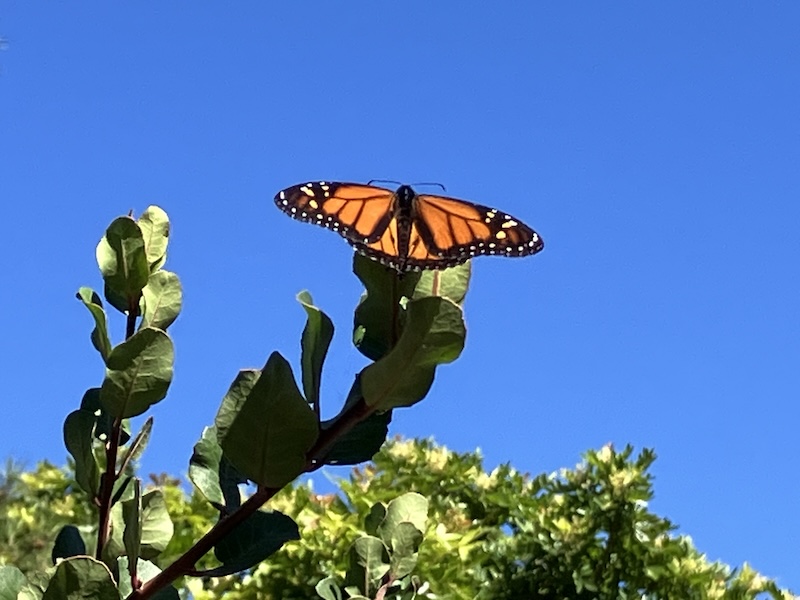 When I went back outside to finish a yard clean-up project, I had a visitor — this magnificent Monarch who stayed still long enough to spread her wings for a picture, vibrant and alive: