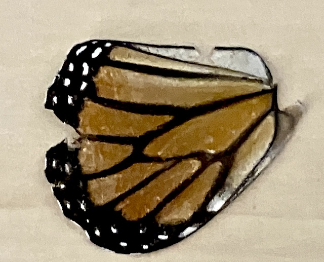 In the corner of the garden close to the back gate, I found a wing that belonged to a Monarch butterfly. Poor tattered little one, colors dull and listless; I carefully picked her up to bring inside the house to spend eternity resting in a pretty box of similar treasures.