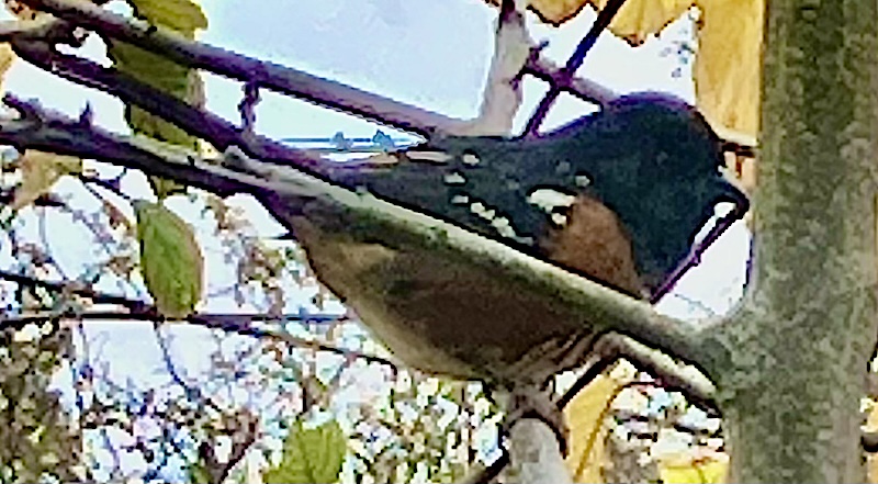 The black-headed grosbeak eats pine and other seeds, berries, insects, spiders, and fruit. I didn’t hear him sing, however, his voice is a rich warble similar to that of an American robin, but more fluent, faster, softer, sweeter, and mellow with rising and falling passages that make the song much longer than the robin’s. The note is a sharp ik or eek. Both the male and female sing, but have different songs.