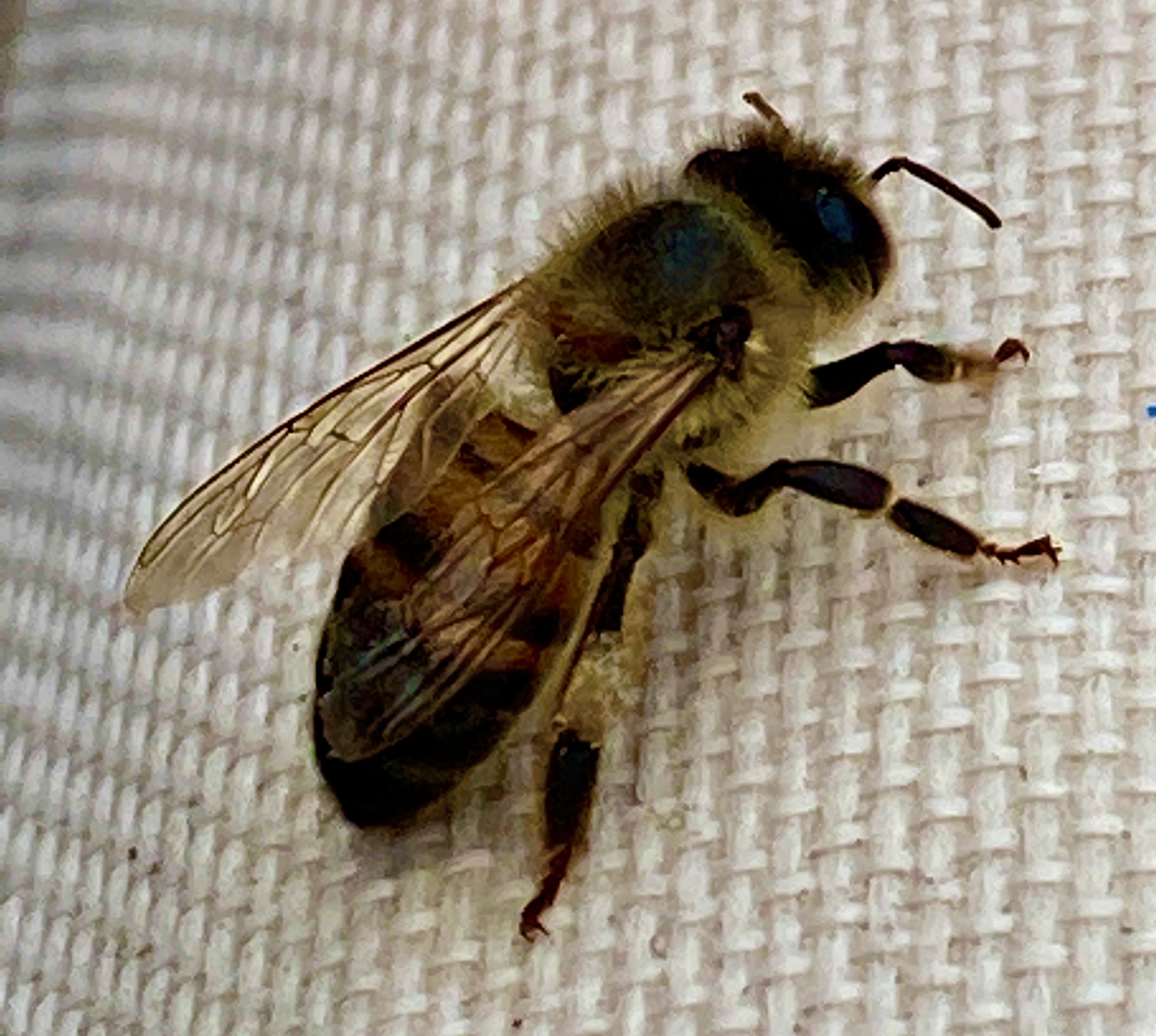 As I was taking out the trash, I saw a single bee on the deck. I crouched down to get a better look at the little guy and while he was still moving, he seemed lethargic and tired, but not dead, thank goodness.