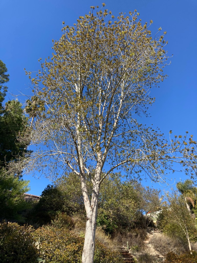 This particular tree seems to be on its (his/her?) own schedule or maybe the mild weather is confusing the internal timeline, because in the last two weeks, it flowered, dropped the flowers, and is showing all new green leaves. In January!