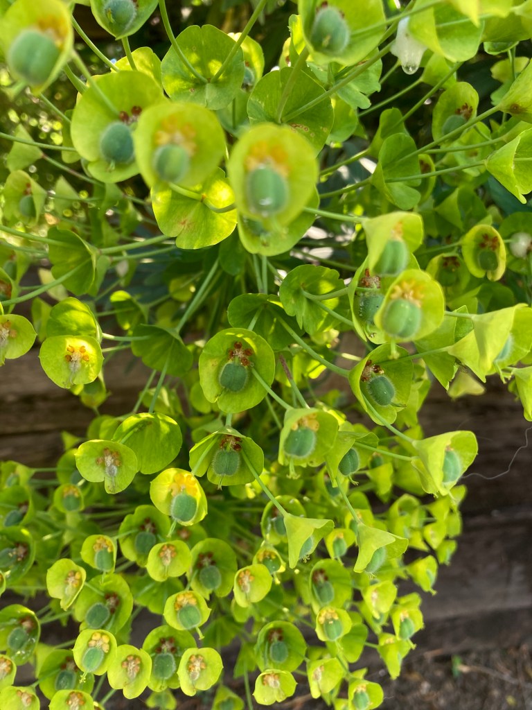 I looked up from weeding the veg garden at green leaves and the bluest sky kissed by the sun. There’s a bird singing somewhere in there but I couldn’t locate it.